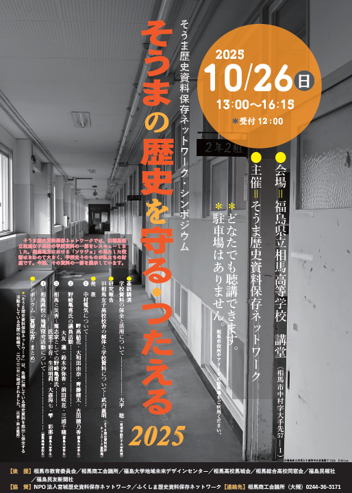 後援:相馬市教育委員会/相馬商工会議所/福島大学地域未来デザインセンター/相馬高校馬城会/相馬総合高校同窓会/福島民報社/福島民友新聞社 協賛NPO法人宮城歴史資料保存ネットワーク/ふくしま歴史資料保存ネットワーク
