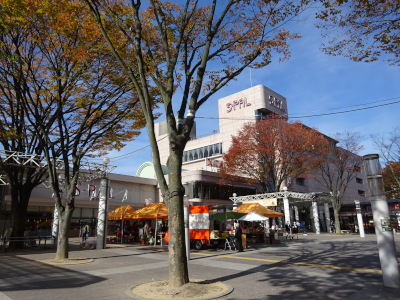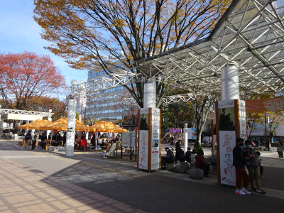 In warm autumn Sunday at the station square of Fukushima Station, a market event where autumn foodstuff were sold were held. Many people were gathered.