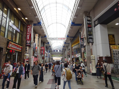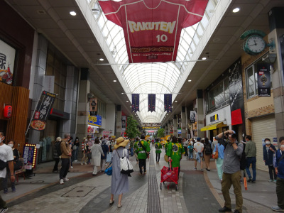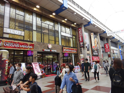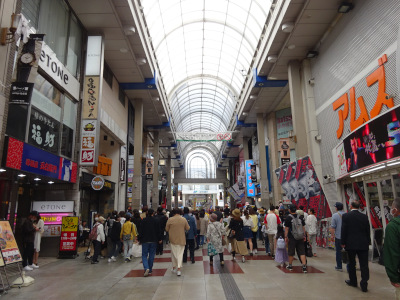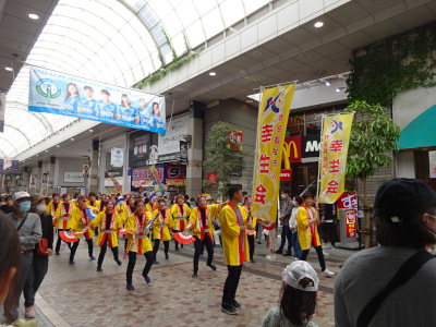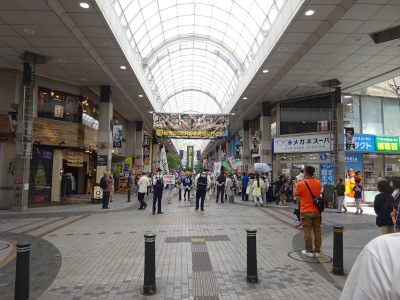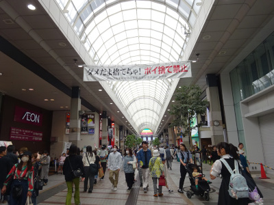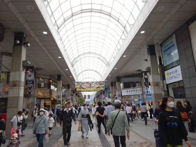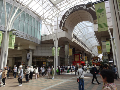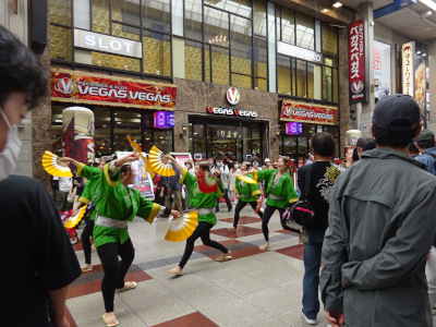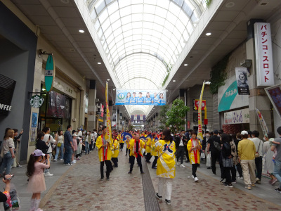 of the central street from the station. The recording point was on the course of Suzume Odori dance parade, and there were many people watching the parade around here. The music of Suzume Odori dance resounded around the arcade.