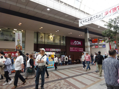 This was recorded in front of AEON shopping center. Many people were there, too. Because the goal of Suzume Odori parade was near the recording point, loud voices for traffic control by police were heard frequently. In front of AEON shopping center, food stands selling beer and chicken were installed.