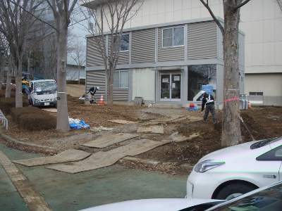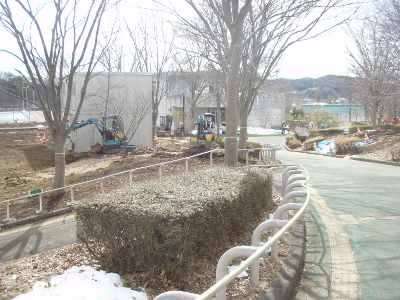 Around the gymnasium, contaminated soil was removed using heavy machines.