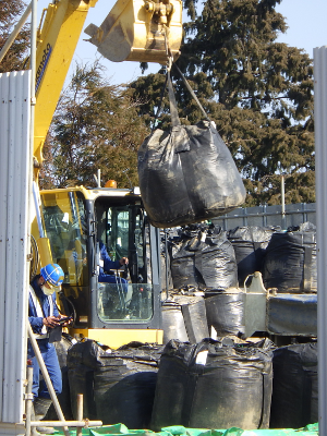 Flexible container filled with contaminated soils were being stacked.
