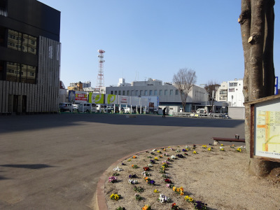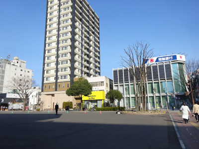 A young man were practicing skateboard in the Machi-naka Square, as usual.
