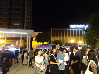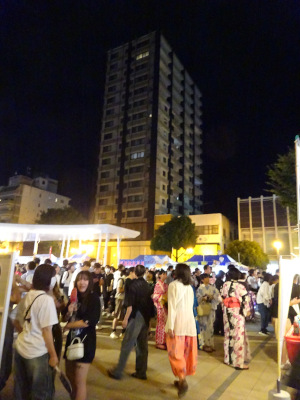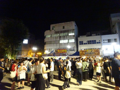 On the day of the Waraji (Japanese sandal) Festival, food and drink stalls were installed in Machinaka Square, and many people gathered there.