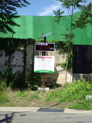 仮置場の脇に設置されたモニタリングポストによると,この日の放射線量は0.18μSv/hであった.(写真右)