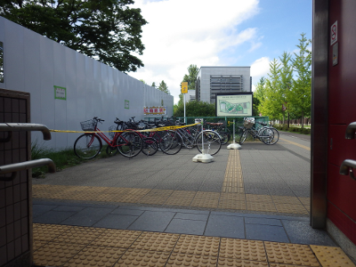 さらに,この日は,点字ブロックの上に支柱が置かれたテープの前に駐輪するものまで出現し,ますます悪い状況となっている。