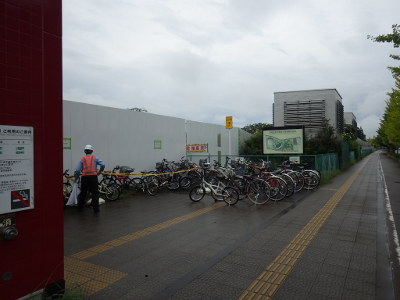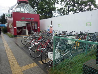 私が駅に到着した際は雨が一時的に止んでいたが,朝,雨が降っており,午後も雨が降るという天気予報のこの日も,宮城野原駅前にはいつも通り数多くの違法駐輪された自転車が置かれていた。点字ブロックの上に置かれた自転車の数も,いつもの平日と変わらない。