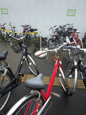 右端の写真で確認できるように,駐輪禁止であることを示すためのテープを張るための支柱は,この日も,点字ブロックを配慮した位置に置かれていた。しかし,自転車がこのように置かれていたのでは,点字ブロックは使えない。このような自転車の置かれ方をみると,このテープの張り方は,ほとんど意味をなしていないように思えてくる。