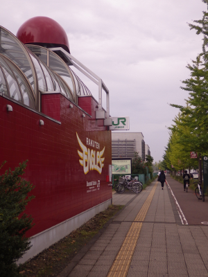 今日のテープを張るための支柱の位置も,点字ブロックの利用に配慮した位置である。今日は,いつもよりテープがピンと張られているように見える。