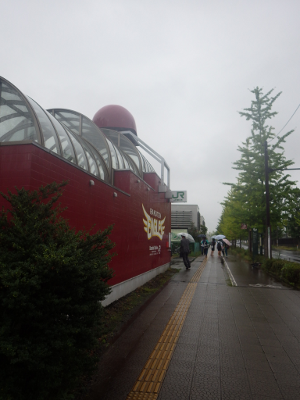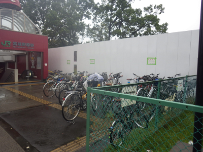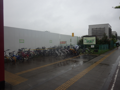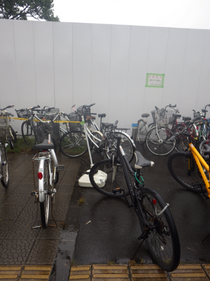 バリアフル宮城野原の記録を始めてから100日目のこの日,朝からかなり強い雨が降っていたため,宮城野原駅前に違法駐輪された自転車の数は,いつもよりかなり少なかった。違法駐輪された自転車の数が少ないためか,点字ブロックに直接かかる形で駐輪している自転車は2台だけだった。しかし,点字ブロックを利用するのに邪魔な位置に停められた自転車まで含めれば,10台弱であった。