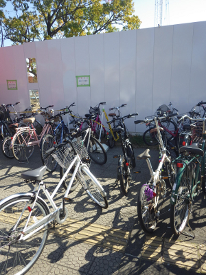 よく晴れた土曜の午前,宮城野原駅前に違法駐輪された自転車の数は,平日の朝と比べて非常に多い。それに伴い,点字ブロックの上に置かれた自転車の数も,平日の朝より多い。