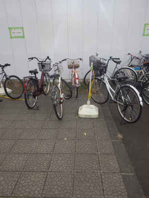 前日,点字ブロックの上に停めていた某医療・福祉系の専門学校を経営している学園のステッカーを貼った自転車は,この日は,点字ブロックの真上ではなく,駅出口の逆側のフェンスの真横の一番歩道よりの位置(写真右から2枚目の一番手前の自転車)に停めていた。この自転車の持ち主は,できるだけ歩道に近い位置に駐輪したいと考えているのかもしれない。