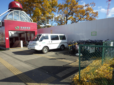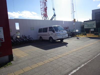 この日は,所用で,お昼頃宮城野原駅前を通りかかった。いつも自転車が違法駐輪されている位置に,JRの関連会社の車が置かれている。この車を置くために整理したのか,駅の入口から遠いあたりに,自転車が密集して置かれている。また,車より駅側にも数台,壁沿いに自転車が置かれている。