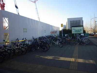 駐輪禁止を示すテープは,12月15日と同様で,駅から1本目の支柱はフェンスから自転車約1台分のスペースのところに,2本目の支柱は,フェンスと点字ブロックの中間あたりの位置に置かれている。さすがに,前日のままにしておいてはまずいということに,気が付いたのだろう。その結果,テープの手前側に置かれた自転車の数は,前日と比べて,明らかに少ない。