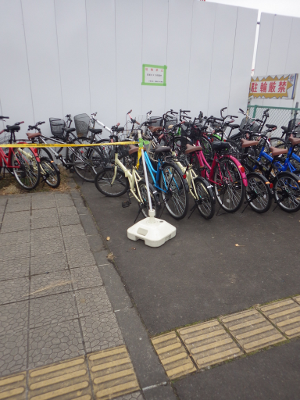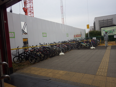 駐輪禁止を示すテープは,前日同様,駅から1本目の支柱はフェンスから自転車約1台分のスペースのところに,2本目の支柱は,フェンスと点字ブロックの中間あたりの位置に置かれている。そして,このテープが作り出す結界の中に,違法駐輪された自転車は整然と並べられている。自転車誘導員に尋ねたところ,誘導員たちが整理したとのこと。ご苦労様です。