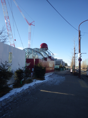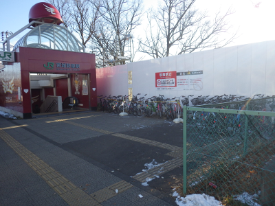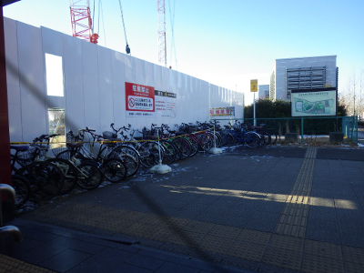 駐輪禁止を示すテープの支柱は,この日は2本とも仮囲いから自転車1台分の位置に建てられていた。そして,テープの手前側に置かれた自転車は,無かった。