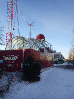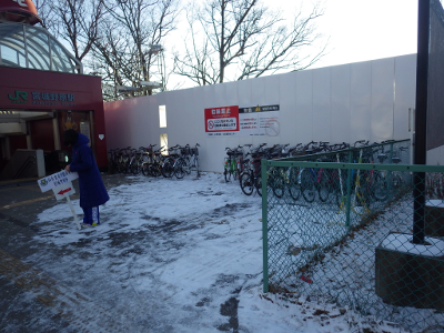 前日同様,仮囲いから自転車1台分位のところに張られていた駐輪禁止を示すテープの支柱は,駅入口と逆側のフェンスの前に,ひっそりと置かれていた。また,紐で縛られた自転車は,1月14日から変わらず,そのまま放置されていた。