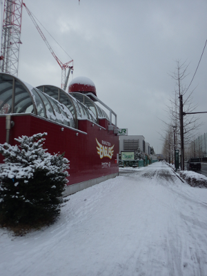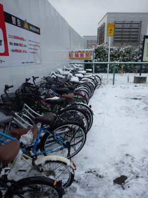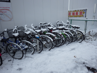 紐で結ばれた自転車は,未だに,ここに放置されたままである。これらの自転車の上に積もった雪と,他の自転車の雪を見比べると,他の自転車のほとんどは,今朝,ここに置かれたものである可能性が高そうだ。さすがに,これだけ道が凍ると,自転車を利用する人が少ないようだ。