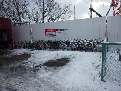 自転車の数が少ないため,この日の自転車の置かれ方は,仮囲いに沿って自転車1台ずつ並べられているだけだ。