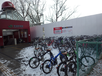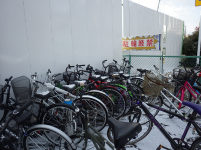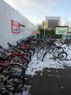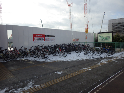 また,街が少々雪化粧したこの日,宮城野原駅前に違法駐輪された自転車の数は,いつもよりは若干少なめであった。点字ブロックの上に置かれた自転車の数は6台で,前日よりは多いが,いつもよりは少なめである。