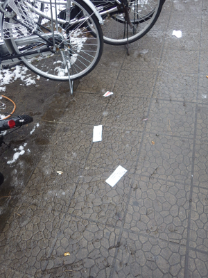 この下げ札は,ずいぶん,路面に落とされている。違法駐輪を平気でするような人にとっては,ごみをまき散らすことも平気なのであろう。ここに違法駐輪するような人々は,モラルに問題がある人々であることをよく表している。