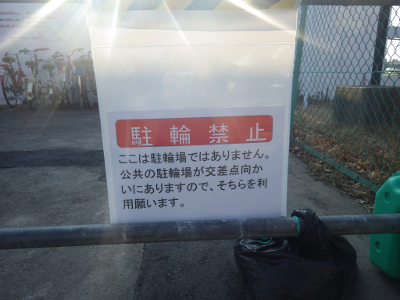 バリケードの中には,駅入口側に1台,自転車が停められていた。この自転車は,バリケード封鎖以前から,この駅前によく駐輪していた自転車である。このような自転車に対して,警告書を貼り付けるなどの対処を早急にしないと,このバリケードの中に自転車を置くものが,続出する可能性があることを指摘しておこう。