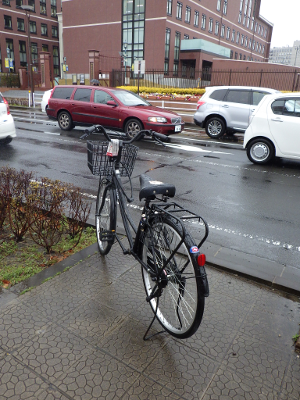 歩道に停められた自転車は,先週,駅舎の横に停められていたものだ。ハンドルには,違法駐輪をやめるよう求めるタグが貼られたままだ。また,よく見ると,この自転車には鍵がかけられていない。もしかすると,この自転車の所有者は,自分で処分するとお金がかかるので,このあたりの管理者に撤去してもらおうと目論んでいるのかもしれない。