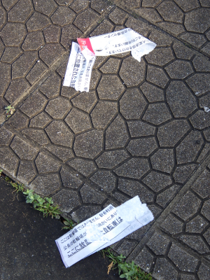歩道に停められた自転車は,前日とは異なる自転車だ。前日違法駐輪していた自転車は,ハンドルに貼られていたタグを路上に捨てて,去っていったようだ。