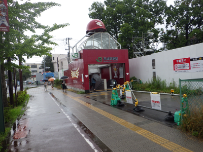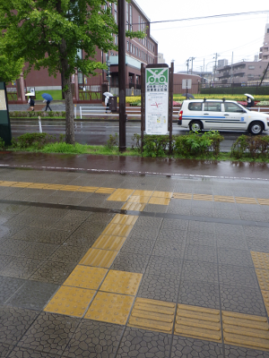 朝から雨が降っていたこの日,宮城野原駅前の球場側の駅舎付近に違法駐輪された自転車はなかった。球場側の点字ブロックの利用に支障となる障害物もなかった。