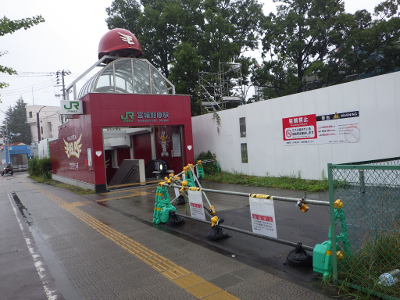 小雨が降るこの日,宮城野原駅の球場側付近には,違法駐輪された自転車はなかった。点字ブロックの障害となるものはない。