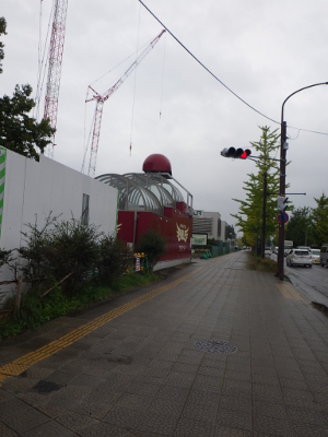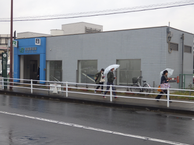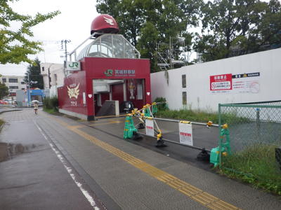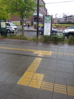 小雨が降るこの日,宮城野原駅前の球場側の出入口付近に違法駐輪された自転車はなかった。点字ブロック利用の支障となるような障害物もなかった。