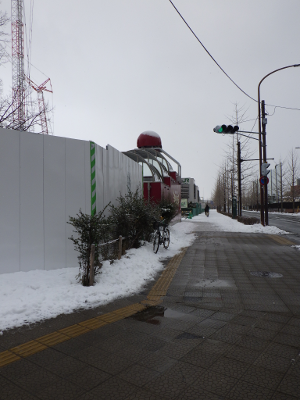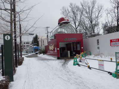 雪が積もったこの日,宮城野原駅の球場側の駅舎前には,