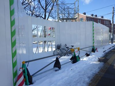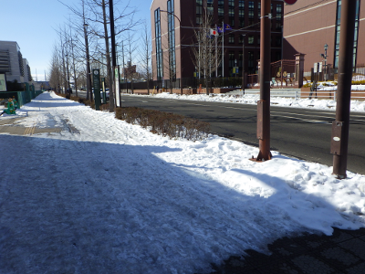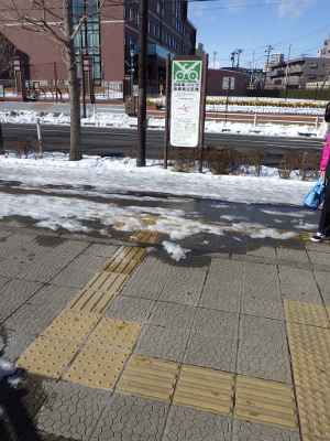 点字ブロックは,駅の敷地内は雪かきされて使えるようになっていたが,歩道側に出ると,まだ雪に埋もれていて,使用できなかった。