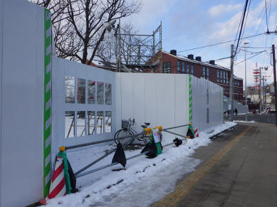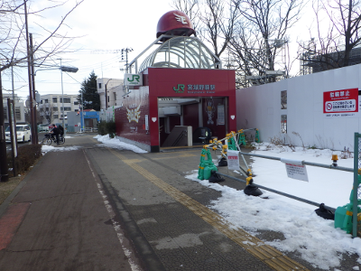 宮城野原駅前に仙台市委嘱の自転車誘導員が立つこの日,駅前の球場側の駅舎周辺には,違法駐輪された自転車はなかった。点字ブロックは,ごく一部雪が残っていたが,概ね使用できる状態であった。。