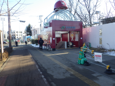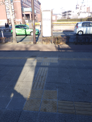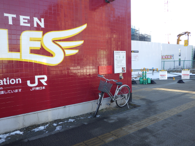 この日も,宮城野原駅前の球場側の駅舎前には,1台の自転車が違法駐輪されていた。この自転車は,前日も,このあたりに違法駐輪されていた自転車と同一のものだ。この位置に1台だけ違法駐輪されている分には,点字ブロックの利用に支障がないが,真似をする自転車が増えてくると,確実に点字ブロック利用者の邪魔になる。さらに,この日の位置への駐輪は,非常時の消防栓利用の妨げにもなる。管理者には,迅速な対応をお願いしたい。