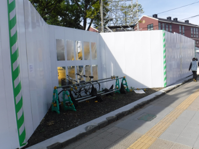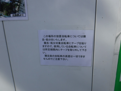 旨書かれた掲示がされていたことである。この掲示のため,この日は違法駐輪された自転車がなかったのかもしれない。なお,この掲示に対応して,放置された1台1台の自転車に貼られたと思われる掲示が,