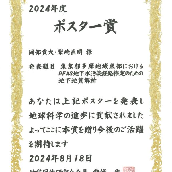2024年8月17~18日につくばカピオホール(茨城県つくば市)で開催された地学団体研究会第78回総会(つくば)で、柴崎研4年生の岡部貴大さんが次のポスター発表を行い、ポスター賞を受賞しました。