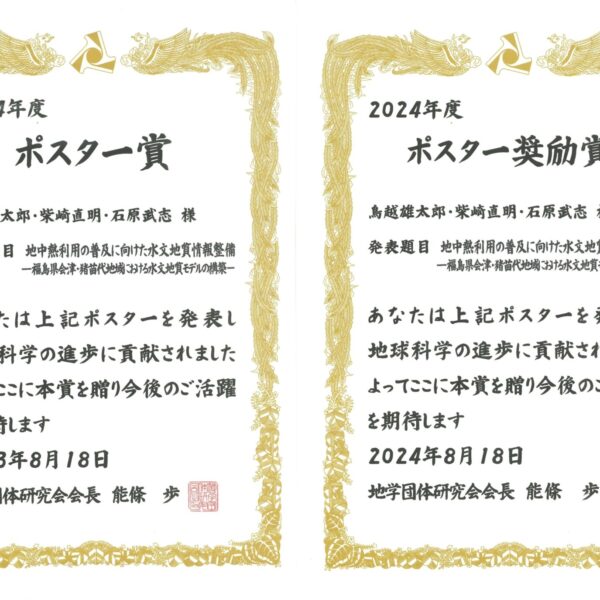2024年8月17~18日につくばカピオホール(茨城県つくば市)で開催された地学団体研究会第78回総会(つくば)で、柴崎研大学院2年生の鳥越雄太郎さんが次のポスター発表を行い、ポスター賞およびポスター奨励賞を受賞しました。