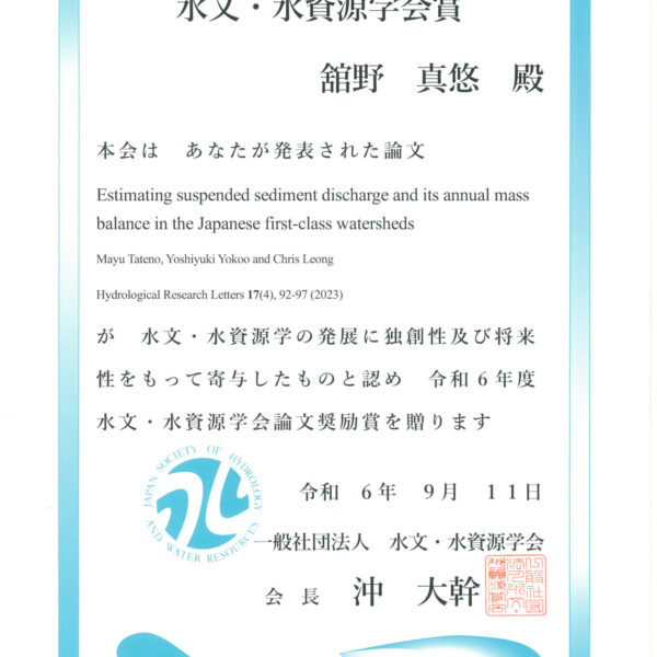 2024年3月に本学大学院共生システム理工学研究科の博士前期課程を修了した舘野真悠さんが研究成果の一部を在学中に発表した論文が,「水文・水資源学の発展に独創及び将来性をもって寄与したものと認め」られ,「令和6年度水文・水資源学会論文奨励賞」を受賞しました.
