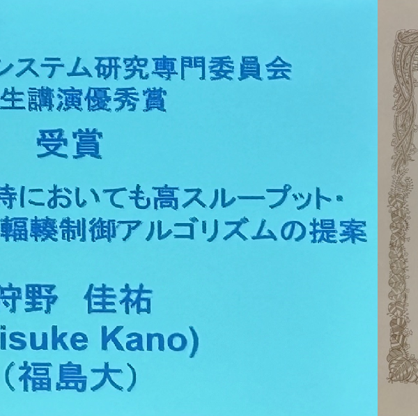 電子情報通信学会ネットワークシステム研究会で学生講演優秀賞を受賞しました