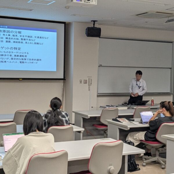 実習の初回には,交通企画課交通事故分析統計係より講師をお招きし,県警で行っている交通事故の統計分析の基本について,ご教授いただきました。