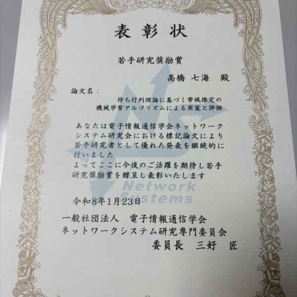 共生システム理工学類内海研究室4年生・髙橋 七海 さんが電子情報通信学会ネットワークシステム研究会(2026年1月22日-23日:高知市)で、下記論文の講演により、ネットワークシステム若手研究奨励賞を受賞しました。