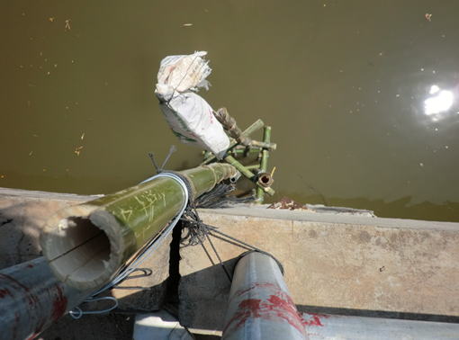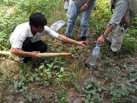 ベトナム・ドンタップ省タイ島の灌漑用井戸で,水質調査のために採水する様子